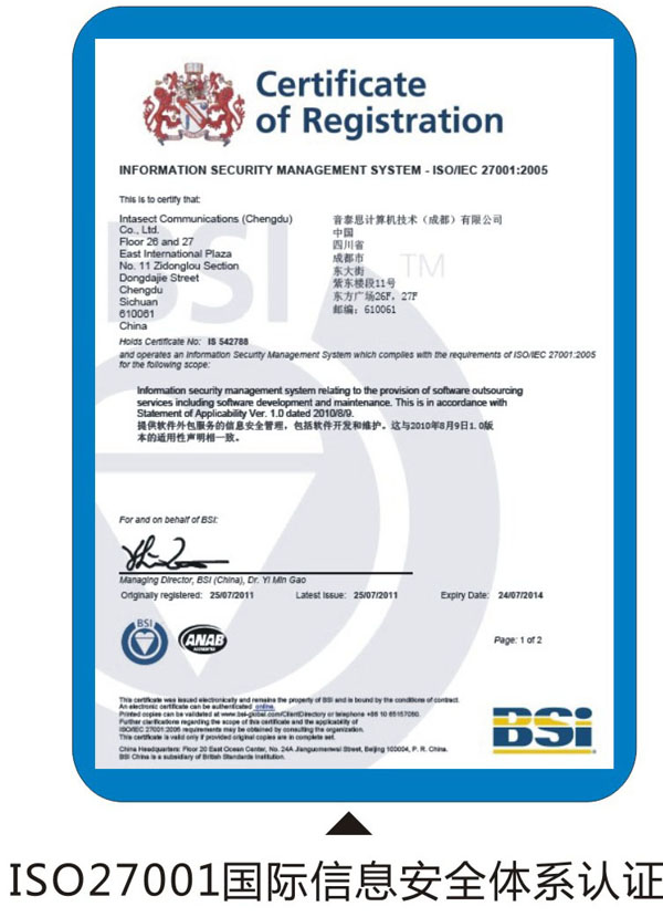在公司的信息安全管理中,音泰思根據(jù)公司實(shí)際情況建立了可實(shí)施,可持續(xù)改善的安全管理體系,不僅完全通過(guò)客戶的檢查,而且于2009年9月通過(guò)ISO27001國(guó)際信息安全體系的認(rèn)證。