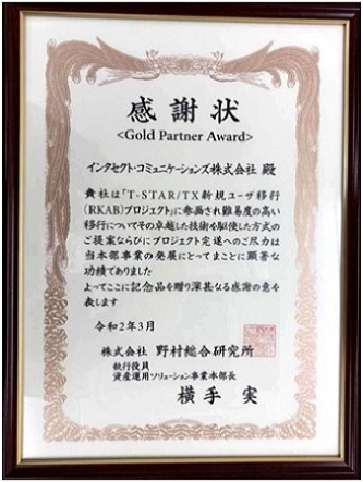 該項目在2019年NRI項目年度社員投票中被評為唯一的一個金獎項目。獲得NRI頒發(fā)的感謝狀!